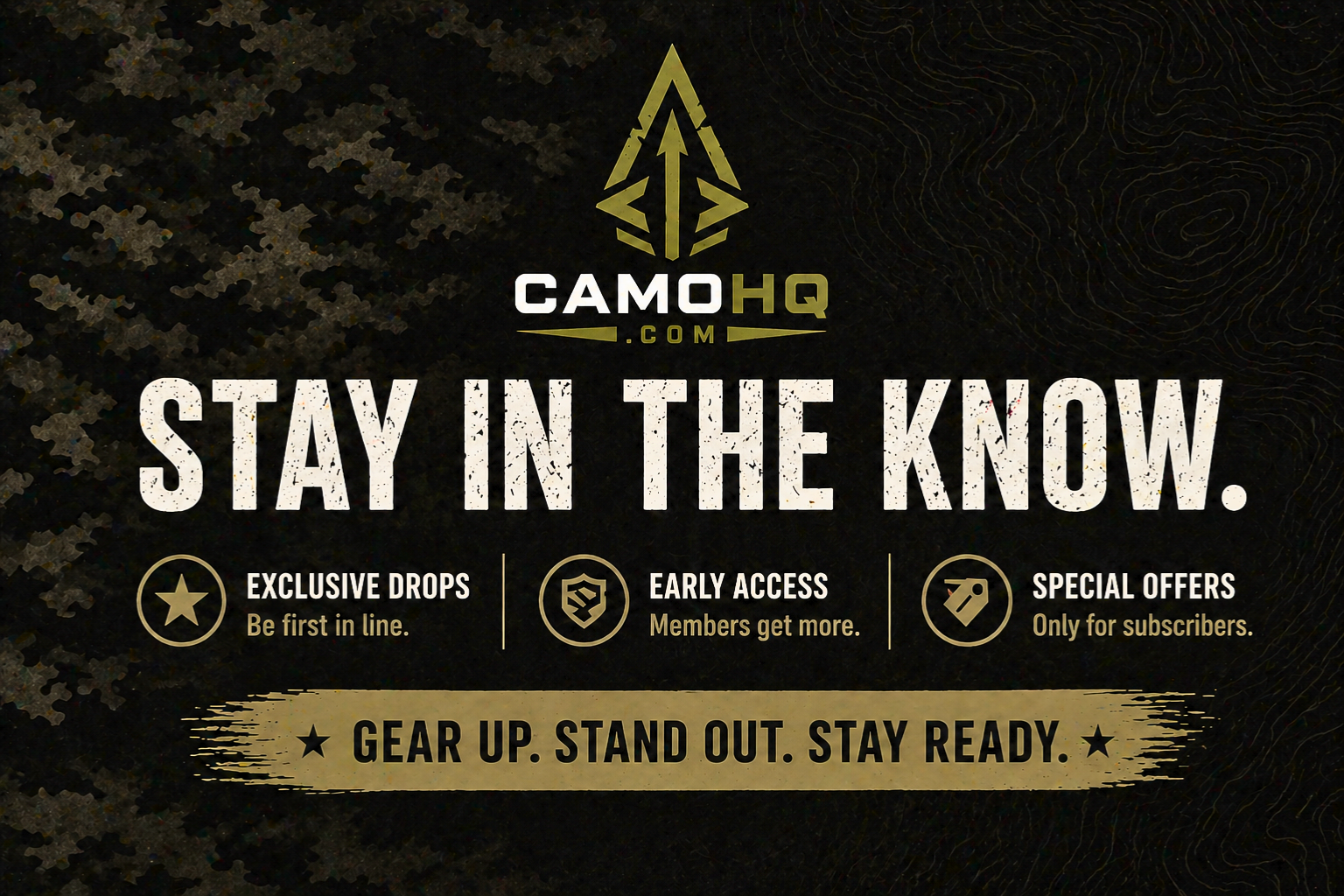 Join the CAMO HQ community and get mission-ready access to what’s next. Be the first to see new camo drops, unlock early access to limited releases, and receive exclusive offers reserved for insiders.